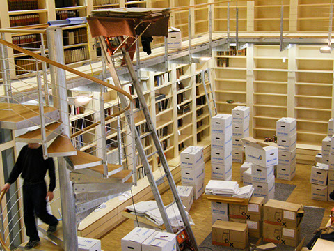 erfolgt analog dem Einpacken. Es spielt dabei keine Rolle ob die Regale von oben nach unten oder umgekehrt belegt werden. Für erforderliche Lücken innerhalb der Bestände in den neuen Regalen sorgen Reiter, mit dem Vermerk, wie viel cm Lücke gelassen werden muss.